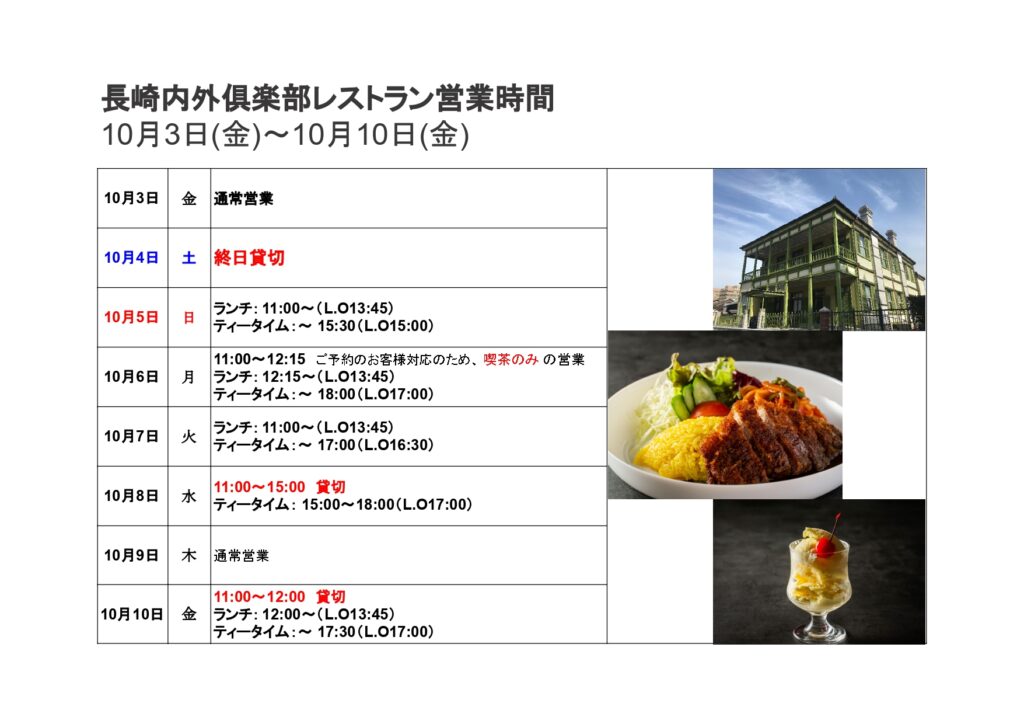 【長崎内外俱楽部レストラン】10/3(金)~10/10(金) 営業時間のお知らせ
