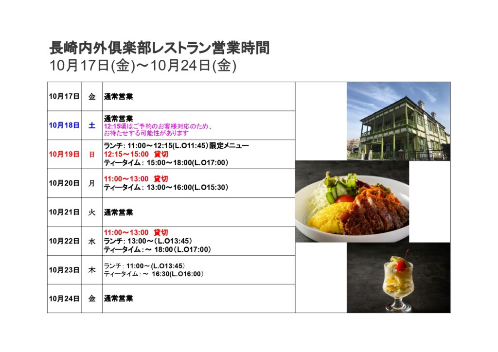 【長崎内外俱楽部レストラン】10/17(金)~10/24(金) 営業時間のお知らせ