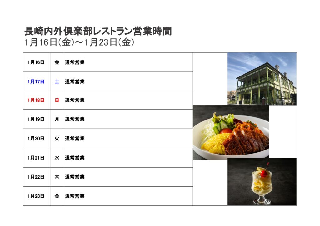 【長崎内外俱楽部レストラン】1/16(金)~1/23(金) 営業時間のお知らせ