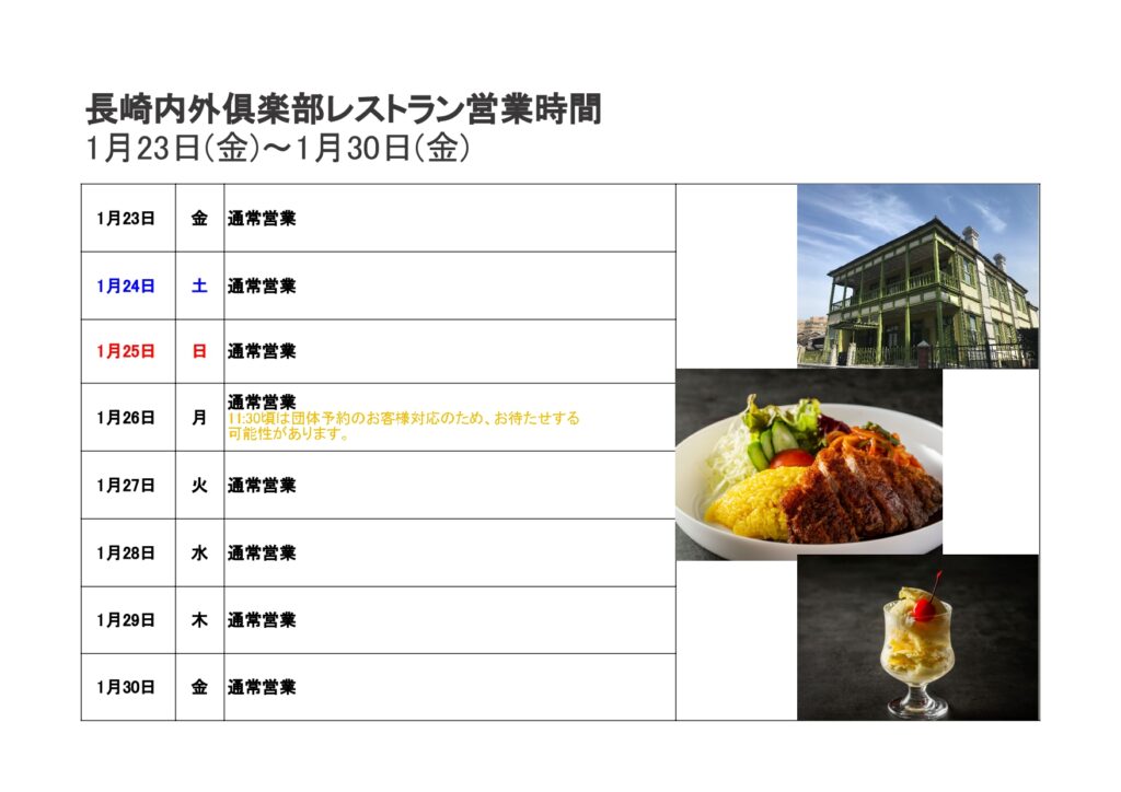 【長崎内外俱楽部レストラン】1/23(金)~1/30(金) 営業時間のお知らせ