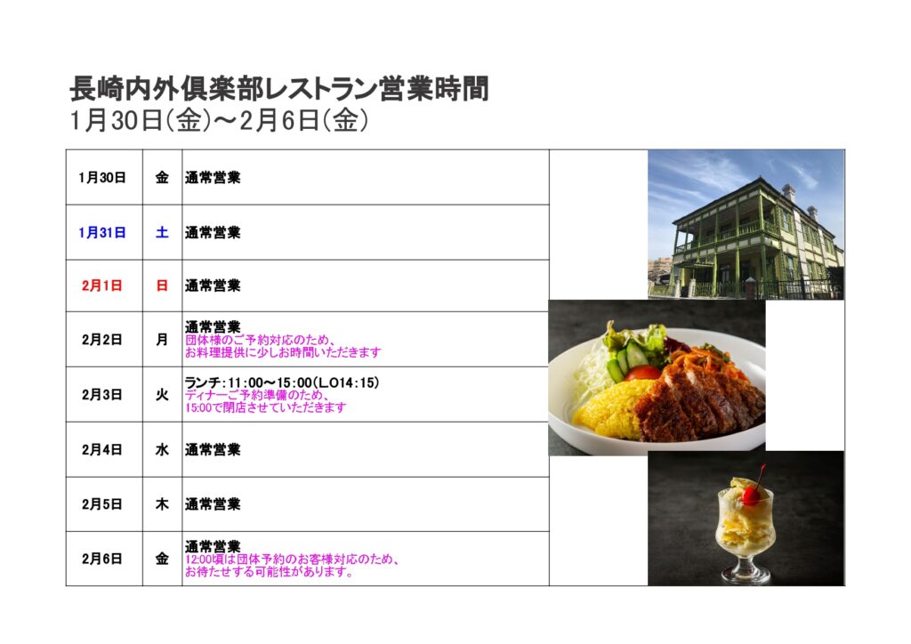 【長崎内外俱楽部レストラン】1/30(金)~2/6(金) 営業時間のお知らせ