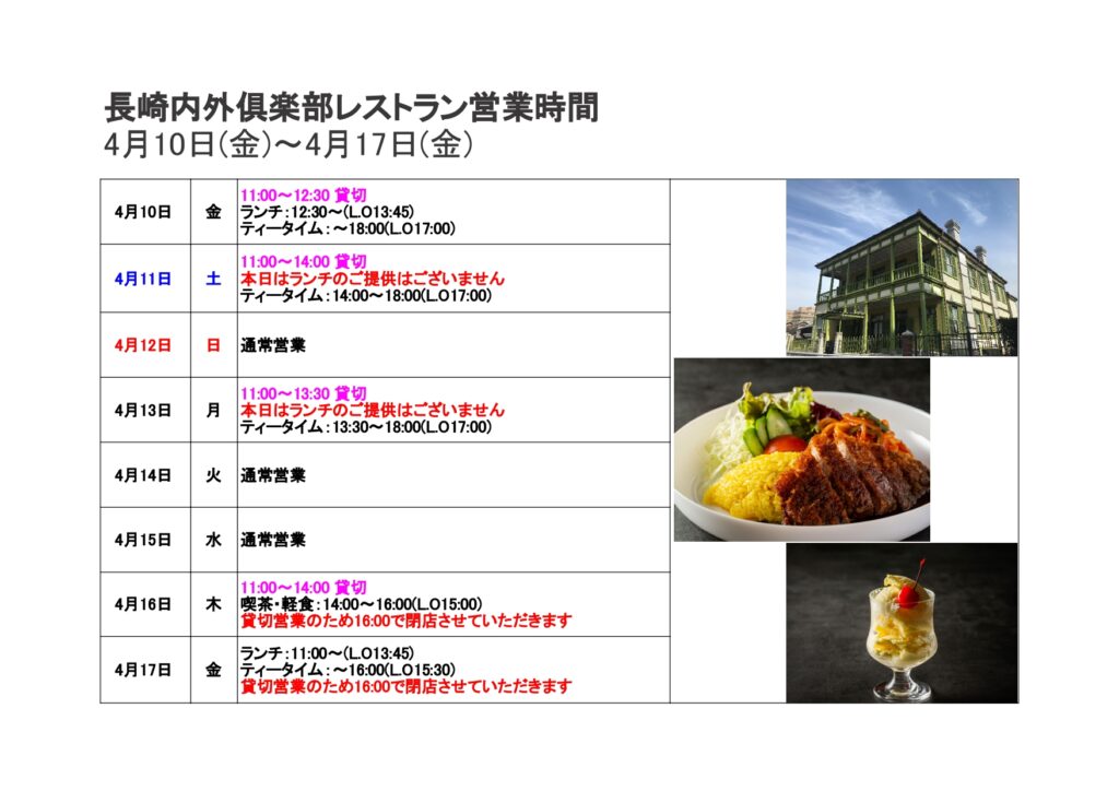【長崎内外俱楽部レストラン】4/10(金)~4/17(金) 営業時間のお知らせ