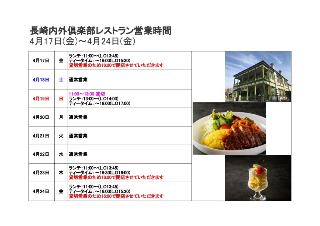 【長崎内外俱楽部レストラン】4/17(金)~4/24(金) 営業時間のお知らせ